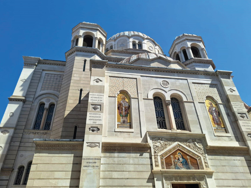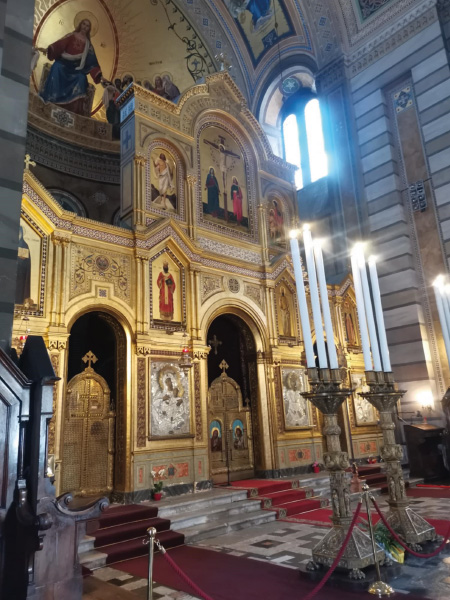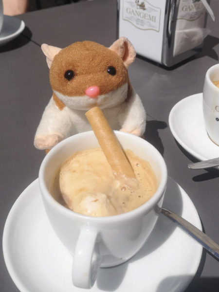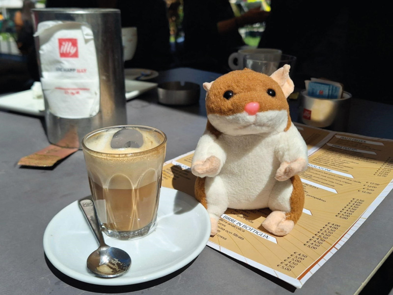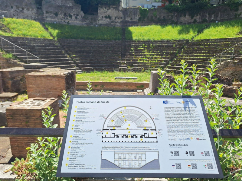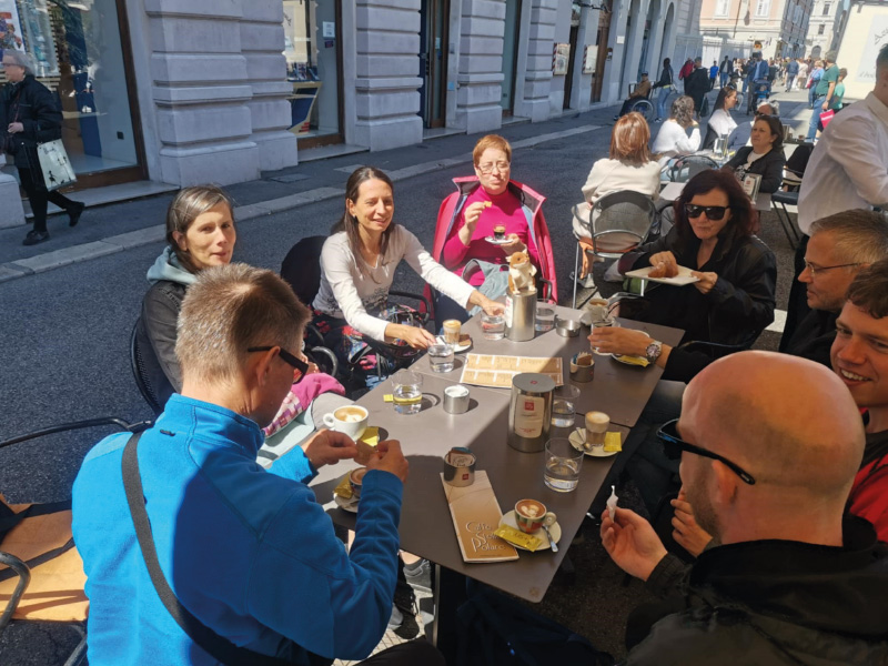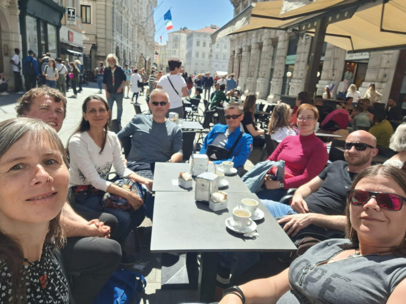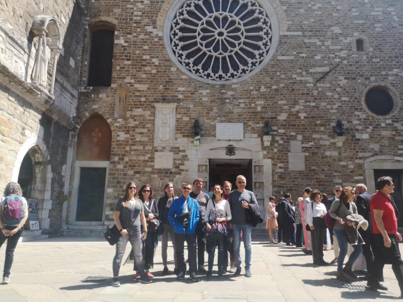 Sergio nas je takoj po pristanku v centru Trsta popeljal do zgodovinske kavarne blizu cerkve Svetega Antona, kjer smo ob sodelovanju simpatičnega italijanskega natakarja in nagovoru našega navitega Sergia, spet opravljali ustni izpit, nato pa pokušali tržaški capo in B in cappuccino di orzo, ter opazovali dogajanje jutranje sobotnega Trsta. Smuknili smo v prelepo pravoslavno cerkev, nato se pa sprehodili po ulicah centra mimo ostankov rimskega gledališča Teatro romano.