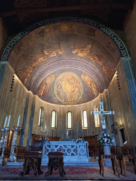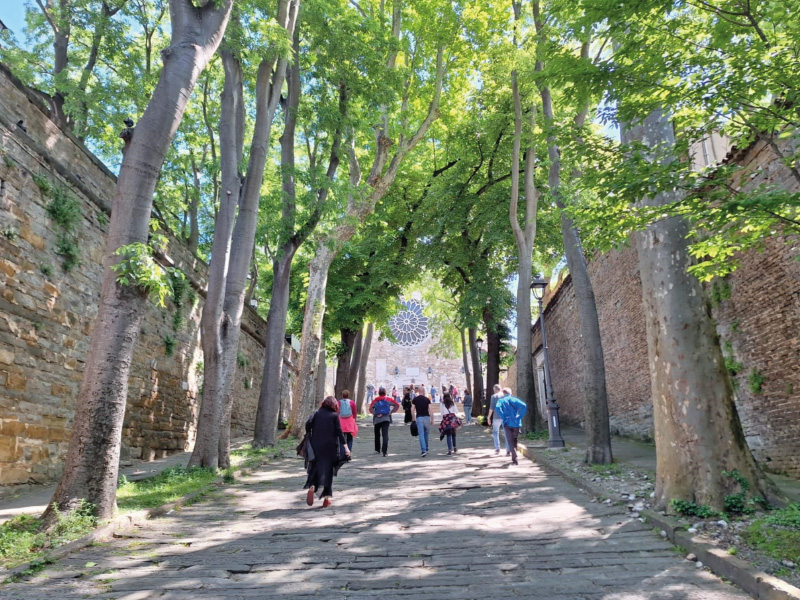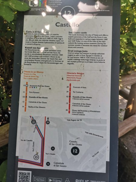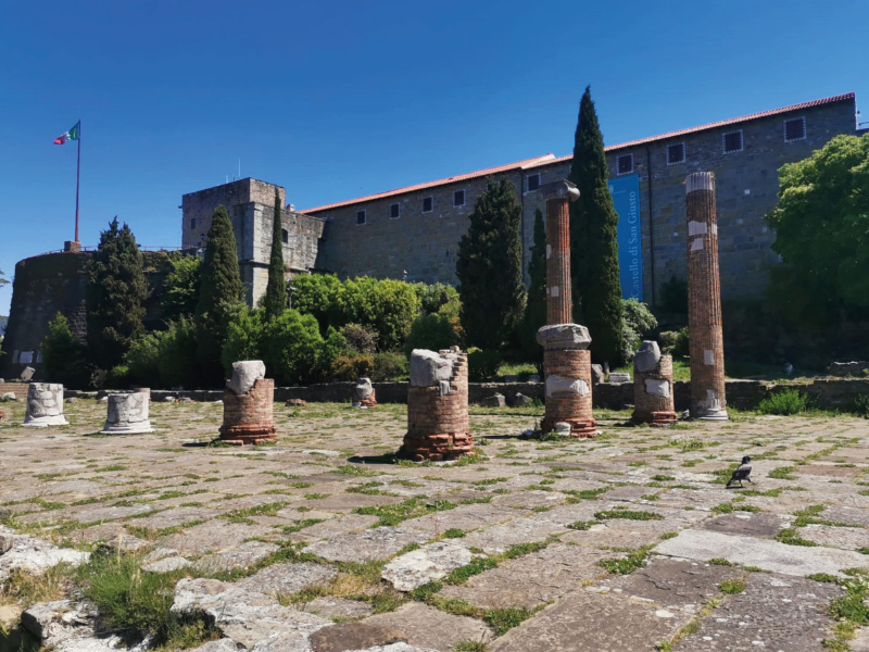 Sergio nas je nato pognal na vzpon na grič San Giusto, ki velja za center starega Trsta in predstavlja tudi simbol mesta. V 1. stoletju so Rimljani sezidali baziliko z lepo rozeto, izdelano iz kraškega kamna. Sprehodili smo se po parku rimskih izkopanin, uživali v razgledu na mesto, si ogledali vznožje gradu ter njegovo pročelje, na koncu pa še prelepe mozaike v sami baziliki.