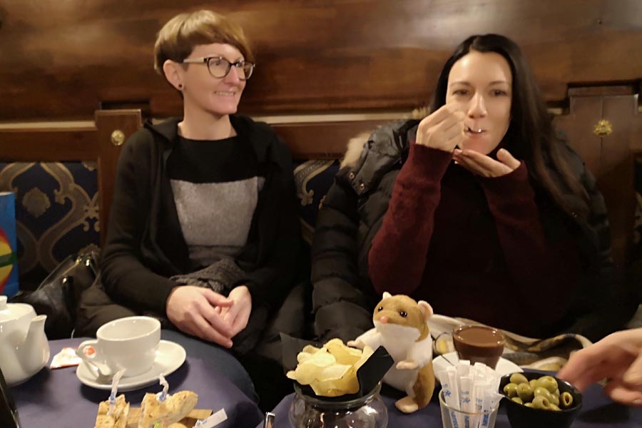 Aktivni del našega popotovanja po mestu smo zatem nadaljevali v bližnjem tradicionalnem lokalu, ki se ponaša s starodavno dekoracijo v lesu in bogato okrašenimi zavesami. Tam smo ob okušanju ponudbe aperitivov in vin sproščeno poklepetali. Pot nazaj se je v obrnjenem redu ob prijetni utrujenosti odvrtela kar nekoliko prehitro, značilno dinamični vozniki javnih prevoznih sredstev pa so poskrbeli za nekaj nenadejanih adrenalinskih užitkov. Nočna vožnja po ulicah Trsta in vzdolž tržaškega greben je ob pogledu na bogato razsvetljen zaliv izkušnja, ki jo bomo le stežka pozabili.